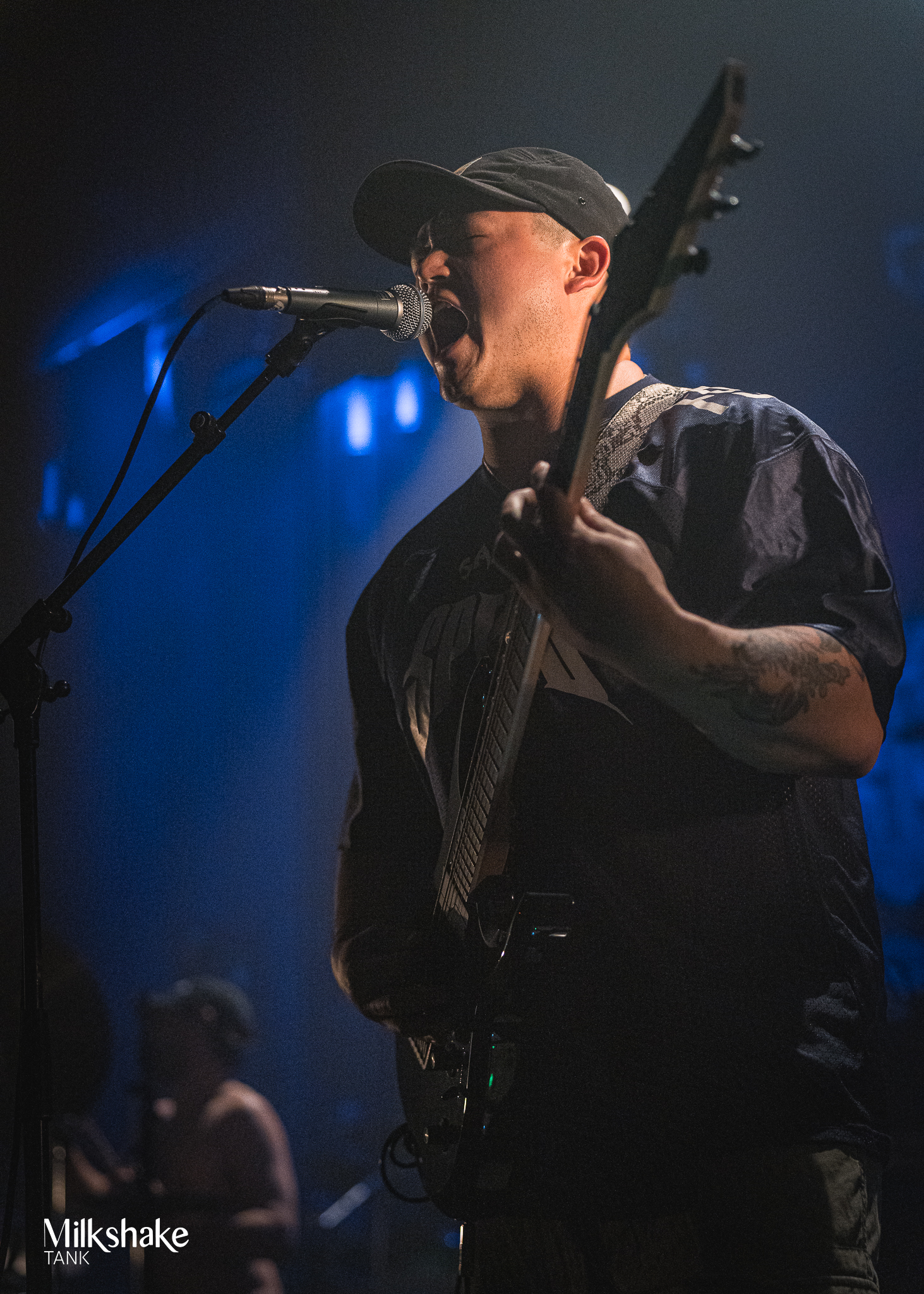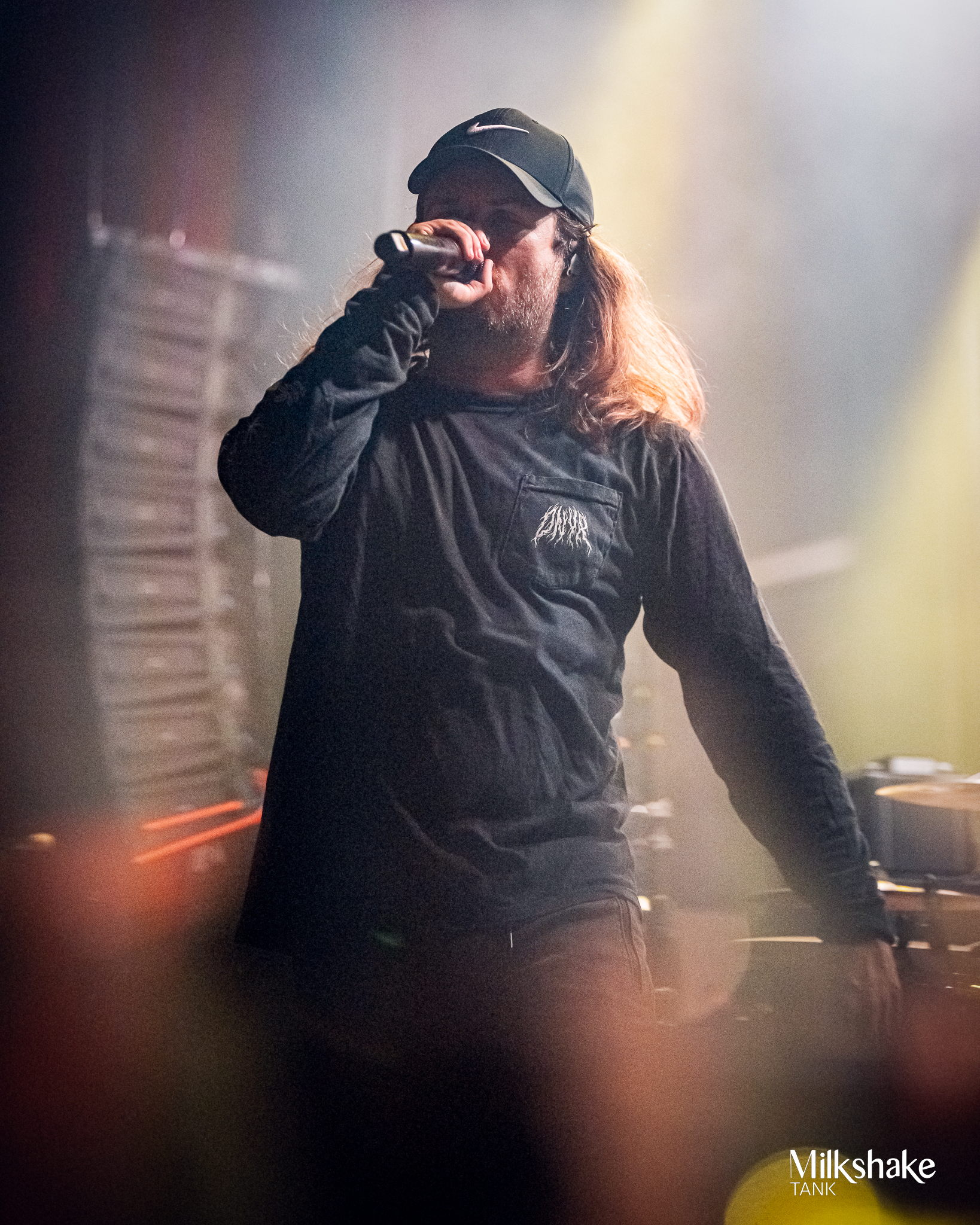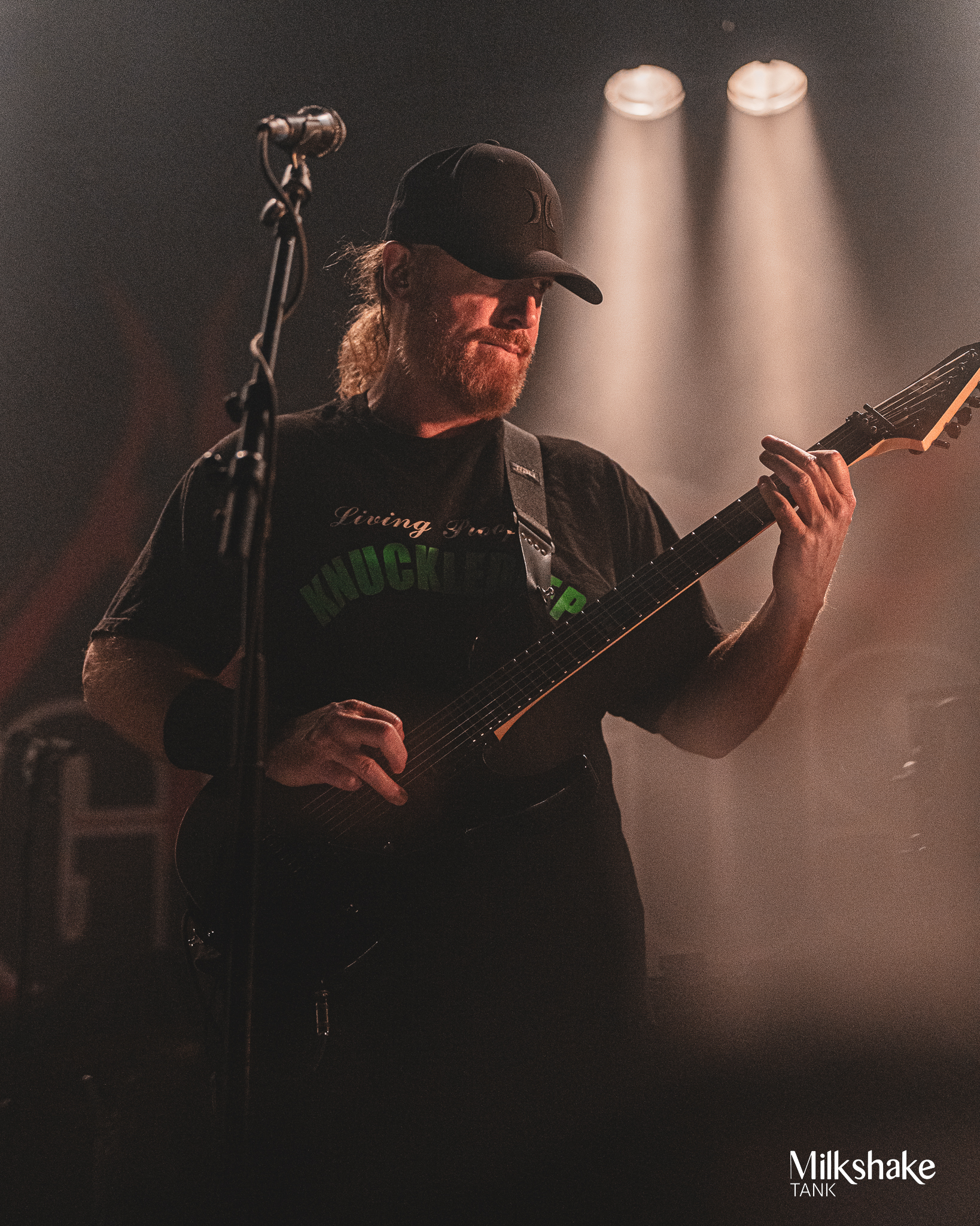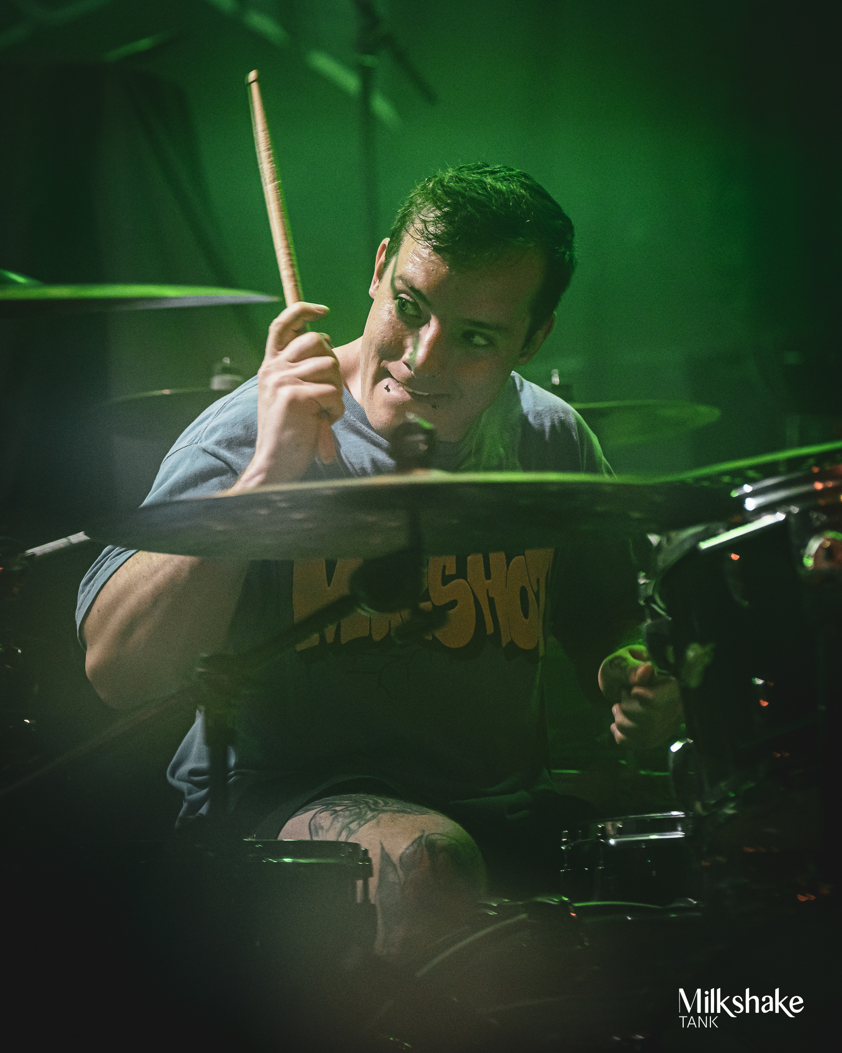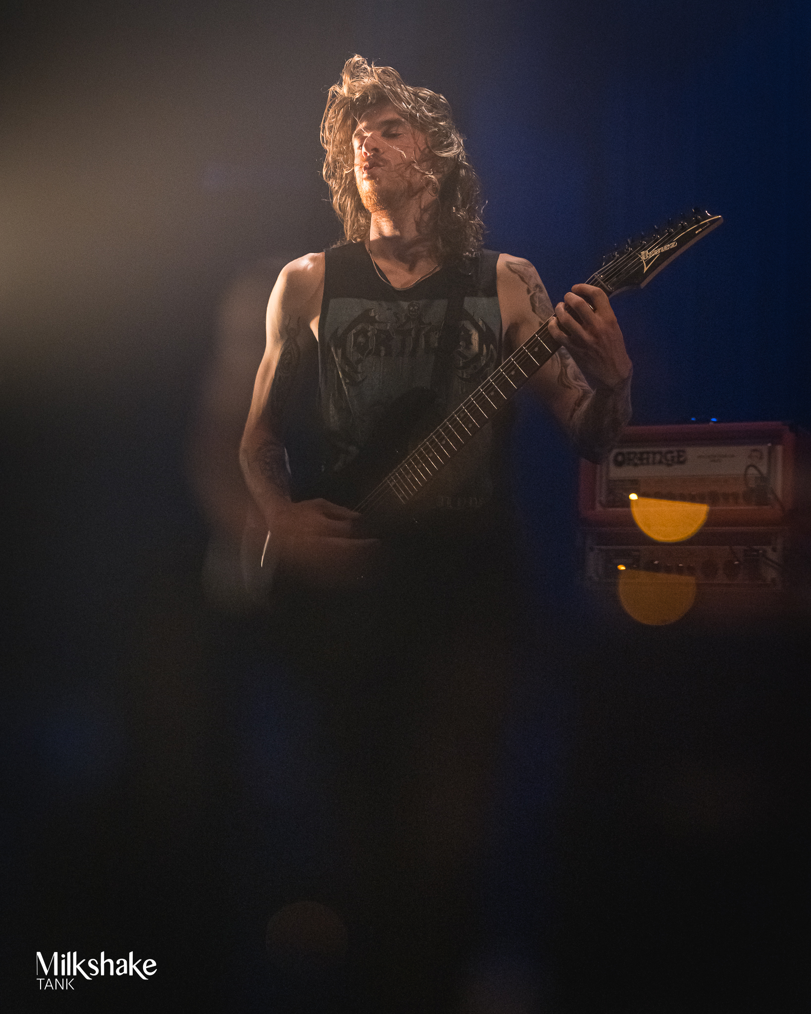 Fit for a King hit the stage with “The Hell We Create“, immediately followed by an explosion of energy. Ryan Kirby, the singer, and Ryan O’Leary, the bassist, who kept spinning his bass around, riled up the crowd, creating frantic circle pits and slams, with the pit going wild. During “Reaper,” Ryan K called for everyone to move and make noise while Ryan O handled the backing vocals. “Backbreaker” triggered another frenzy in the pit, with Ryan Kirby shouting to the back of the room, “Move closer!” The slams multiplied, putting security to the test. Ryan K announced, “Two more songs, everybody scream as loud as you can,” while security seemed overwhelmed by the crowd surfers. Ryan O’Leary shouted, “Make some noise for yourselves and all the bands tonight,” and Ryan K asked if there were any fans of “Band of Sacrifice.” A wall of death was called for and executed amid ongoing slams. The set ended spectacularly with an impressive wall of death and a memorable “blegh.