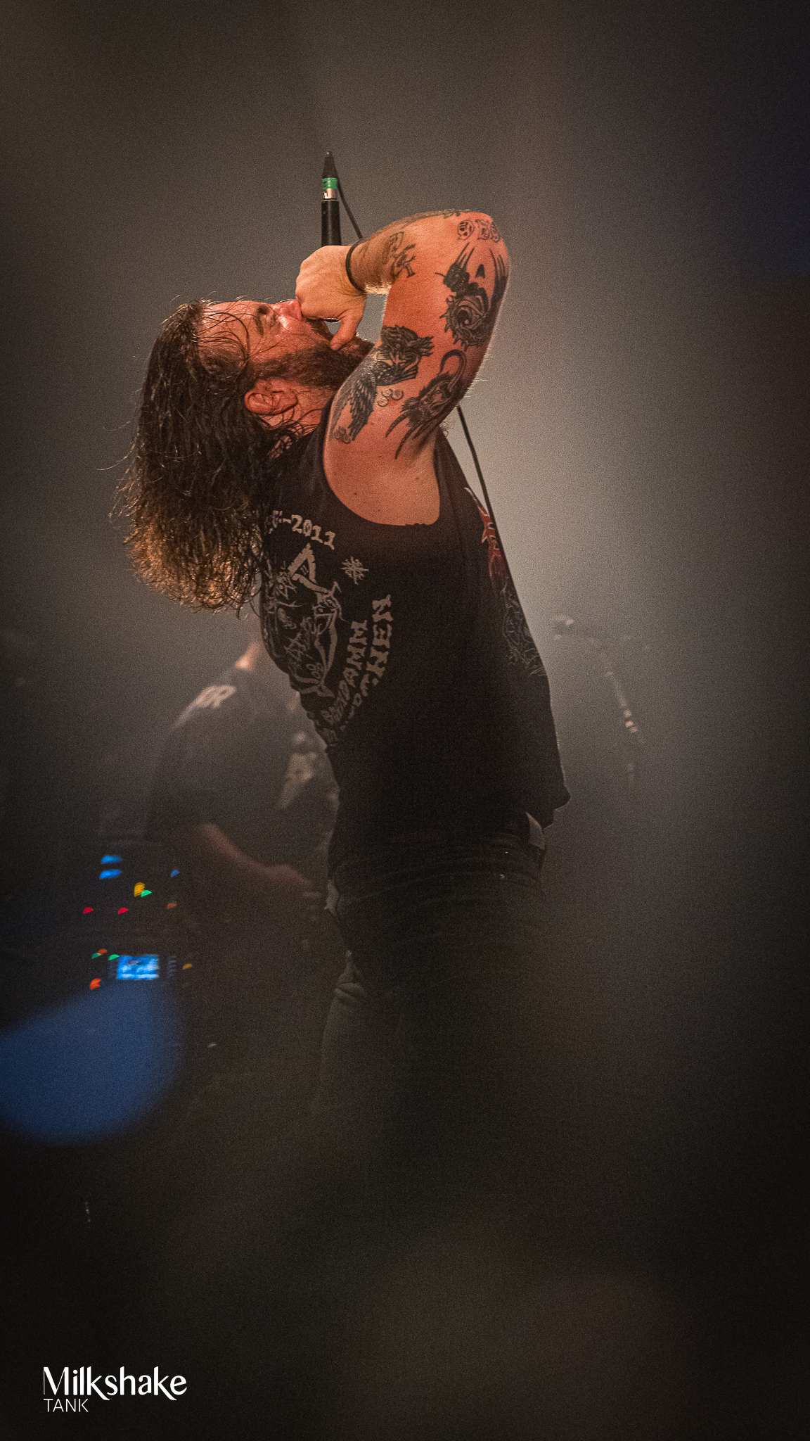 Fit for a King entre en scène avec “The Hell We Create“, immédiatement suivi par une explosion d’énergie. Ryan Kirby, le chanteur, et Ryan O’Leary, le bassiste qui ne cesse de faire tourner sa basse autour de lui, haranguent la foule, créant des circle pits et des slams effrénés, la fosse se déchaîne. Lors de “Reaper“, Ryan K demande à tout le monde de bouger et de faire du bruit, tandis que Ryan O fait les voix secondaires. “Backbreaker” déclenche un énième déchaînement en fosse, Ryan Kirby interpelle le fond de la salle en criant “Rapprochez-vous!!!”. Les slams se multiplient, mettant la sécurité à rude épreuve. Ryan K annonce “Two more songs everybody screams as you can”, tandis que la sécurité semble dépassée par les crowsurfers. Ryan O’Leary crie “Faites du bruit pour vous-même et pour tous les groupes de ce soir”, et Ryan K demande s’il y a des fans de “Band of Sacrifice“. Un wall of death est demandé et exécuté en parallèle des slams qui continuent. Le set se termine en beauté avec un wall of death impressionnant et un “blegh” mémorable.