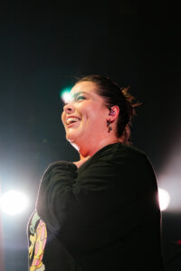 Between songs, she talks to the crowd, relaxed, natural, like she’s just chatting with friends. And then it builds, slowly but surely, until her voice opens up completely, full, radiant, almost vibrating in the already-thick air. A gentle warm-up, sure, but one that already sends chills, promising a night where the voices won’t fall back to earth until the very early hours.