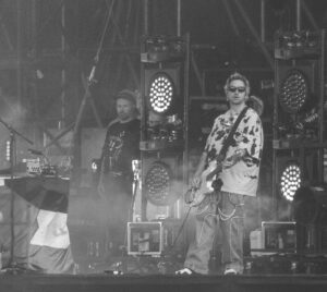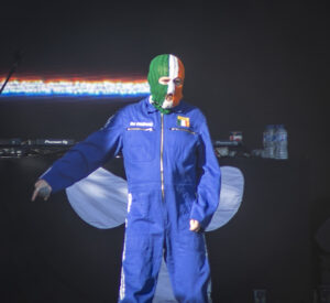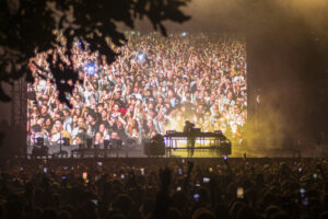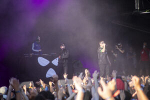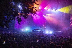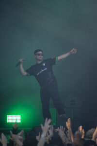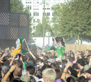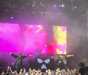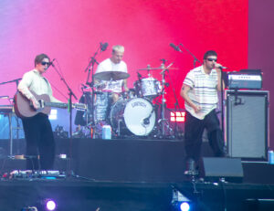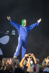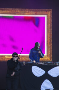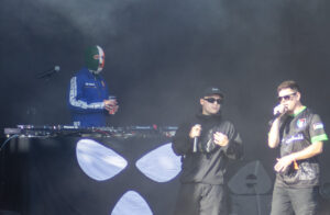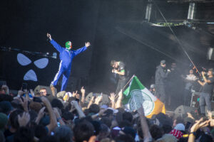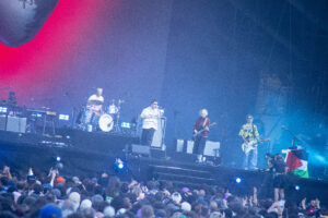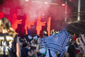 Stereophonics livreront une belle prestation sur la scène Revolut, mais il ne fallait pas s’y tromper. C’était bien sur la scène du Bosquet qu’il fallait être à la même tranche d’horaires. Le trio irlandais Kneecap, bien connu pour son engagement depuis plusieurs mois maintenant, va ramener une marée humaine. C’est archi blindé, l’atmosphère est explosive. Et à juste titre. Si la majorité des personnes présentes ne veulent que faire la fête, et soutenir un peuple qui se fait génocider, quelques erreurs de casting déploient quelques affiches, drapeaux israéliens et sifflets afin de perturber l’entrée de scène. Cela ne va rien changer : de nombreux keffiehs, drapeaux palestiniens et irlandais, maillots de foot des deux nations et autres chants « Free Palestine » agrémenteront tout le concert.