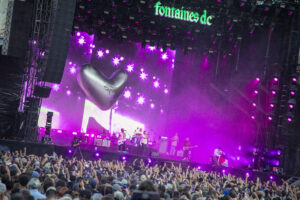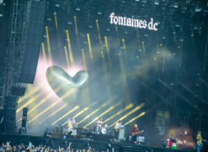 Pas le temps de trop traîner puisque s’enchaîne un autre groupe irlandais, cette fois-ci sur la grande scène du festival : le phénomène Fontaines D.C. Voit une foule gigantesque se presser pour assister à ce qui est la relève « rock » du moment, et il ne faudra pas traîner puisque le groupe démarre direct avec « Here’s the Thing », « Jackie Down the Line » et « Boys in the Better Land ». Toujours avec leur style nonchalant, les fans sont en extase. Eux aussi, à l’instar de leurs compères quelques minutes plus tôt, auront des positions contre le génocide en cours. Drapeaux de la Palestine par-ci, « Free Palestine » par-là. La chanson « Favourite » sera d’ailleurs dédiée à Kneecap. Le final « I Love You » et « Starburster » finira le bon travail. Je pense qu’il est préférable de les voir en salle, pour être mieux intégré à la performance. Ce n’est jamais évident de réussir à autant captiver les premiers rangs d’un festival que ceux qui sont 100 mètres plus loin.