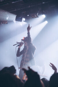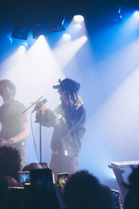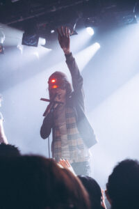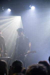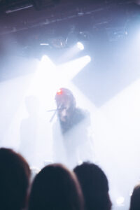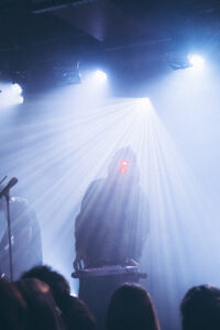 The night kicks off at 8 p.m. with Aldn, joined by his guitarist. On stage, a mic wrapped with a crucifix, a red LED glowing on his forehead, the tone is set. The aesthetic is raw, haunted, almost spiritual. Aldn drifts effortlessly between introspective moments and bursts of electronic chaos, his set spanning the full spectrum of his sonic universe. He captivates without any gimmicks, between the saturated layers of guitar and a voice that shifts from tender to piercing, he delivers a performance that’s both intense and deeply genuine. The crowd is all in.