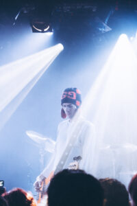 La soirée s’ouvre à 20 h avec Aldn, accompagné de son guitariste. Sur scène, un micro orné d’un crucifix, une LED rouge sur le front : le ton est donné. L’esthétique est brute, habitée, presque mystique. Aldn passe sans effort de moments introspectifs à des explosions électroniques, son set couvrant tout le spectre de son univers musical. Il captive sans artifice : entre les textures saturées de guitare et sa voix tantôt douce, tantôt criante, il donne une prestation intense et sincère. Le public est conquis.